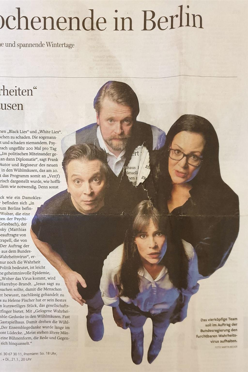 Wir schreiben das Jahr 2020. Vier Menschen in einem Geheimbunker am Potsdamer Platz, tief unter der Erde, ausgewählt von Angela Merkel selbst, sollen die Welt retten. Und es muss schnell gehen. Denn das Desaster scheint unaufhaltsam. Ehen sind bereits tausendfach zerbrochen, Weltkonzernen droht die Pleite, die „Tagesschau“ muss abgeschaltet werden und Horst Seehofer will Bayern in die Unabhängigkeit führen. Denn eine gefährliche Krankheit breitet sich aus: Das Wahrheitsvirus. Die Opfer des Virus verlernen alles, was zivilisierte Menschen im Leben benötigen: Schummeln, Schwindeln, Flunkern, Lügen und Verschweigen. Sie müssen das Gefährlichste überhaupt tun: Allem und jedem die Wahrheit sagen. Unsere Helden arbeiten fieberhaft an einer Lösung. Ein Vier-Sterne-General, ein Medizinnobelpreisträger, der CEO eines Weltkonzerns - waren leider verhindert. Aber es gibt kompetenten Ersatz: Ein Neuköllner Streifenpolizist, eine rheinländische Bienenforscherin, ein Psychiater aus Mecklenburg-Vorpommern und die Gleichstellungsbeauftragte für Britz-Buckow-Rudow. Sie haben keine Ahnung und nur 24 Stunden, ehe das Virus Moskau, Washington und Pjöngjang erreicht. Sie können sich nicht ausstehen, die Geheimdienste sind hinter ihnen her, Olaf Scholz streicht ihr Budget auf 56,50 Euro plus Verpflegungspauschale zusammen, und dann fällt auch noch das Gratis-WLAN fällt aus…